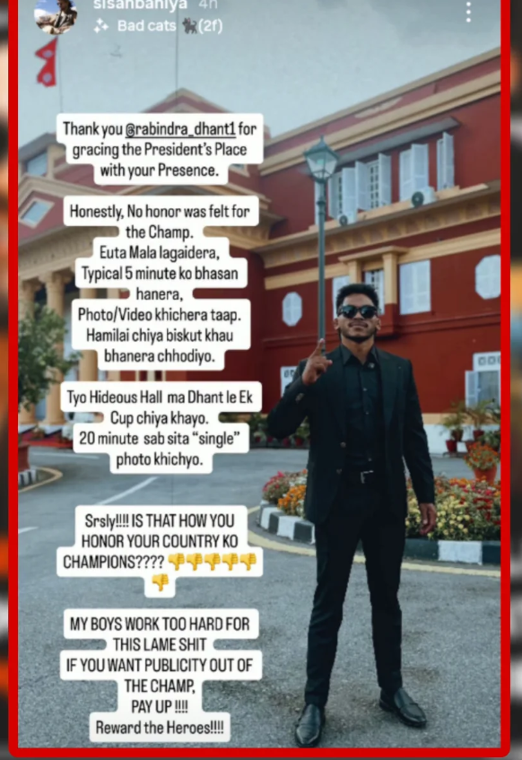 उनका अनुसार च्याम्पियन खेलाडीप्रति राज्यको सम्मान औपचारिक मात्र भयो। उनले लेखेका छन्, “५ मिनेटको भाषण, केही फोटो खिच्ने क्रम, अनि चिया–बिस्कुटमा विदाई – के यसरी देशको लागि खेलेका च्याम्पियनलाई सम्मान गरिन्छ?” उनले कार्यक्रम स्थललाई ‘कुरूप हल’ भन्दै आलोचना गरेका छन्।